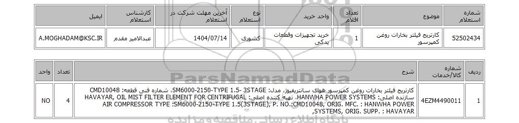 52502434 | کارتریج فیلتر بخارات روغن کمپرسور | 1 | خرید تجهیزات وقطعات یدکی | کشوری | 1404/07/14 | عبدالامیر مقدم | A.MOGHADAM@KSC.IR |