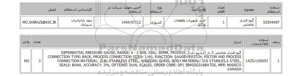 52504097 | گیج فشار تفاضلی | 1 | خرید تجهیزات وقطعات یدکی | کشوری | 1404/07/12 | محمد بابانژادیان شیرازی | MO.SHIRAZI@KSC.IR |