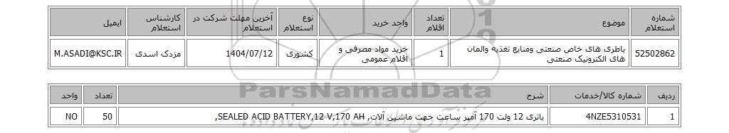52502862 | باطری های خاص صنعتی ومنابع تغذیه والمان های الکترونیک صنعتی | 1 | خرید مواد مصرفی و اقلام عمومی | کشوری | 1404/07/12 | مزدک اسدی | M.ASADI@KSC.IR |
