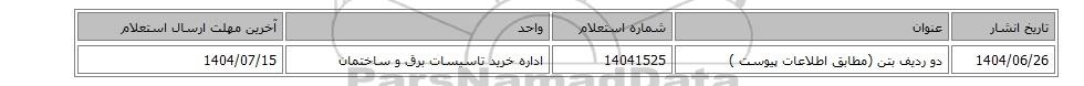 | 1404/06/26 | دو ردیف بتن (مطابق اطلاعات پیوست ) | 14041525 | اداره خرید تاسیسات برق و ساختمان | 1404/07/15 |