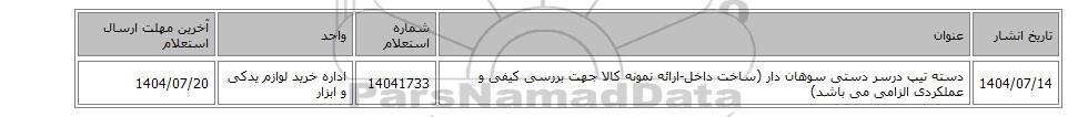 1404/07/14دسته تیپ درسر ‎دستی‏ ‎سوهان دار (ساخت داخل-ارائه نمونه کالا جهت بررسی کیفی و عملکردی الزامی می باشد)14041733اداره خرید لوازم یدکی و ابزار1404/07/20