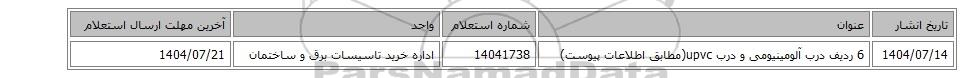 | 1404/07/14 | 6 ردیف درب آلومینیومی و درب upvc(مطابق اطلاعات پیوست) | 14041738 | اداره خرید تاسیسات برق و ساختمان | 1404/07/21 |