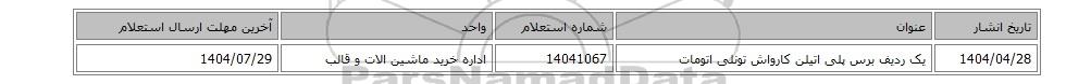 | 1404/04/28 | یک ردیف برس پلی اتیلن کارواش تونلی اتومات | 14041067 | اداره خرید ماشین الات و قالب | 1404/07/29 |