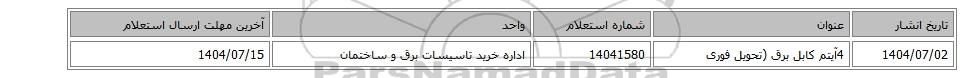 | 1404/07/02 | 4آیتم کابل برق (تحویل فوری | 14041580 | اداره خرید تاسیسات برق و ساختمان | 1404/07/15 |