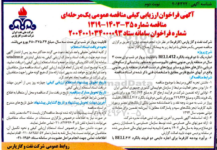 اجاره یک تا دو فروند بالگرد BELL412 با قابلیت پرواز در شب برای مدت 3 سال در منطقه پارس جنوبی به طور دائم و مستمر به منظور پشتیبانی از سکوهای دریایی دکل های حفاری و سایر پروژه های در دست اقدام در منطقه پارس جنوبی واقع در آبهای خلیج فارس مطابق با مشخصات فنی ذکر شده در اسناد مناقصه