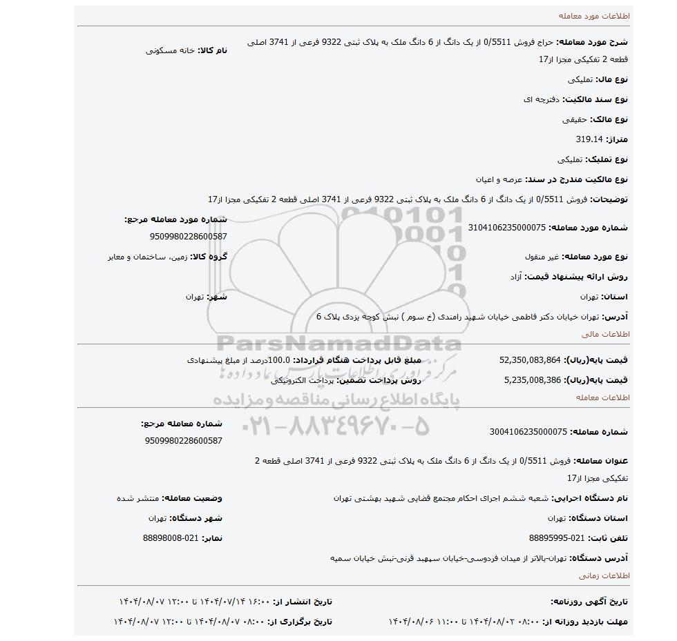 | شماره مورد معامله: 3104106235000075 | شماره مورد معامله مرجع: 9509980228600587 | |