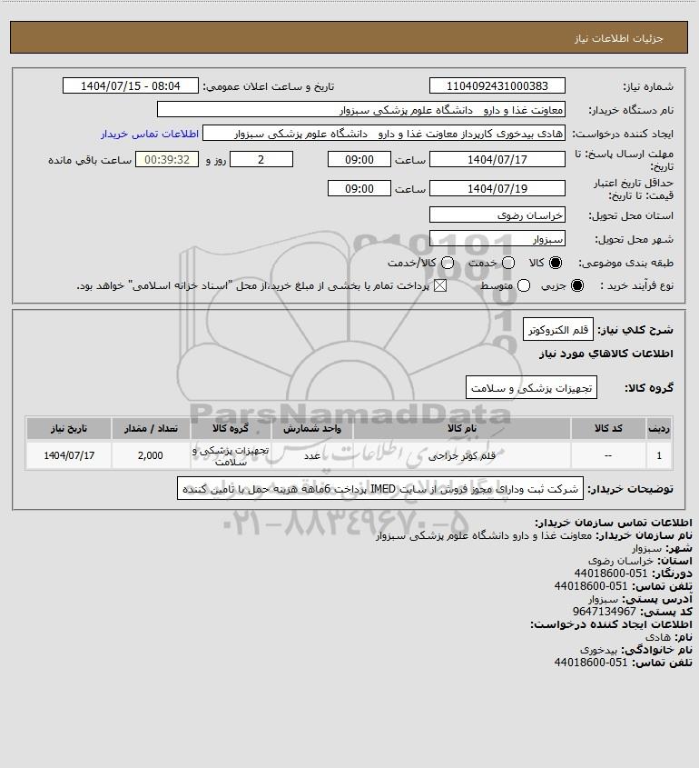 1 -- قلم کوتر جراحی عدد تجهیزات پزشکی و سلامت 2,000 1404/07/17