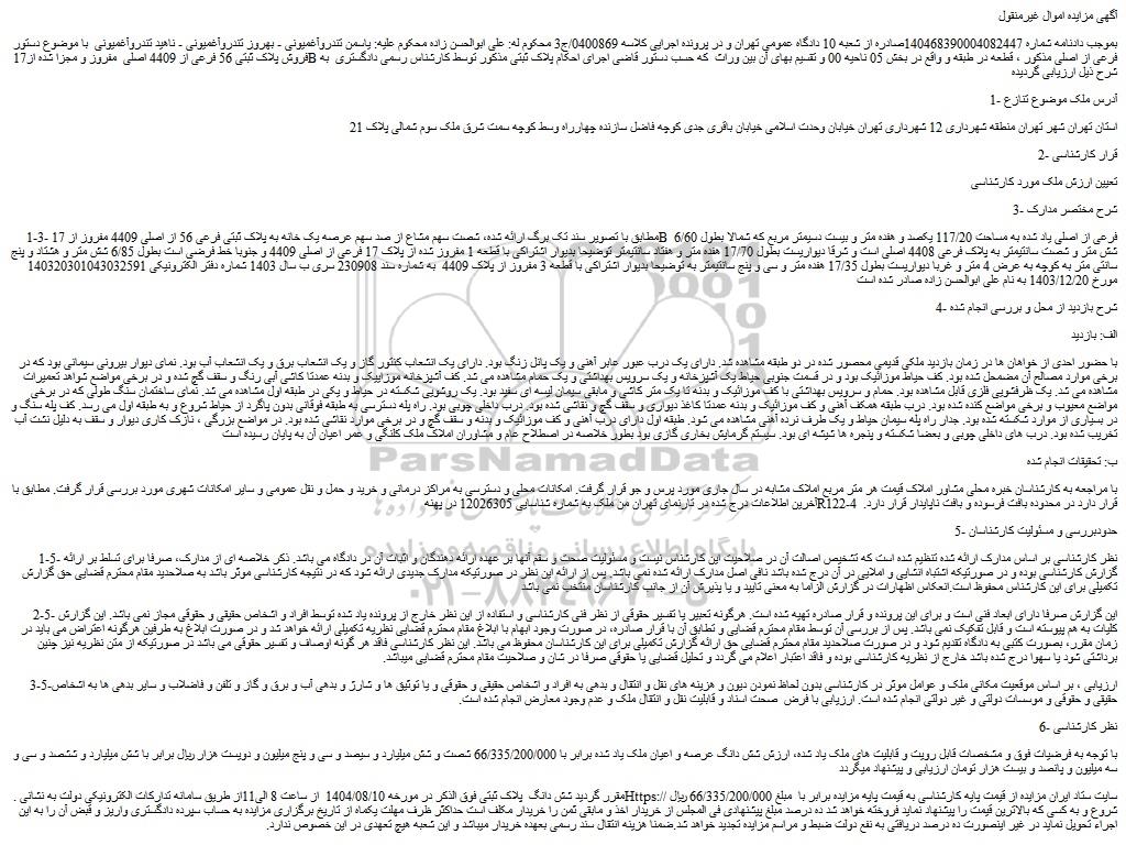 بموجب دادنامه شماره 140468390004082447صادره از شعبه 10 دادگاه عمومی تهران و در پرونده اجرایی کلاسه 0400869/ج3 محکوم له: علی ابوالحسن زاده محکوم علیه: یاسمن تندروآغمیونی - بهروز تندروآغمیونی - ناهید تندروآغمیونی با موضوع دستور فروش پلاک ثبتی 56 فرعی از 4409 اصلی مفروز و مجزا شده از17b فرعی از اصلی مذکور ، قطعه در طبقه و واقع در بخش 05 ناحیه 00 و تقسیم بهای آن بین وراث که حسب دستور قاضی اجرای احکام پلاک ثبتی مذکور توسط کارشناس رسمی دادگستری به شرح ذیل ارزیابی گردیده