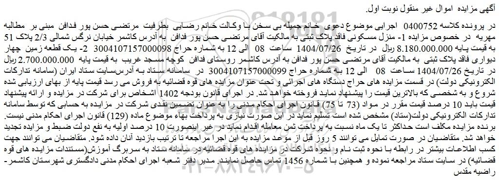 در پرونده کلاسه 0400752  اجرایی موضوع دعوی  خانم جمیله بی سخن با وکالت خانم رضایی  بطرفیت  مرتضی حسن پور فدافن  مبنی بر  مطالبه مهریه  در خصوص مزایده 1- منزل مسکونی فاقد پلاک ثبتی به مالکیت آقای مرتضی حسن پور فدافن  به آدرس کاشمر خیابان نرگس شمالی 2/3 پلاک 51 به قیمت پایه 8.180.000.000 ریال  در تاریخ  1404/07/26  ساعت  08  الی 12 به شماره حراج 3004107157000098  2- یک قطعه زمین  چهار دیواری فاقد پلاک ثبتی  به مالکیت آقای مرتضی حسن پور فدافن به آدرس کاشمر روستای فدافن  کوچه مسجد غریب  به قیمت پایه  2.700.000.000 ریال در تاریخ 1404/07/26 ساعت  08  الی 12 به شماره حراج 3004107157000099  در  سامانه ستاد به آدرسسایت ستاد ایران (سامانه تدارکات الکترونیکی دولت) در قسمت مزایده های حراج دستگاه های اجرائی و تحت عنوان مزایده های قوه قضائیه به فروش می رسد قیمت پایه از بهای ارزیابی شده شروع و به شخصی که بالاترین قیمت را پیشنهاد نماید فروخته خواهد شد. در اجرای قانون بودجه 1402 اشخاص برای شرکت در مزایده و ارائه پیشنهاد قیمت باید 10 درصد قیمت مقرر در مواد (73 تا 75) قانون اجرای احکام مدنی را به عنوان تضمین نقدی شرکت در مزایده به حسابی که توسط سامانه تدارکات الکترونیکی دولت(ستاد) مشخص شده است تسلیم نماید در این صورت نیازی به پرداخت بهاء موضوع ماده (129) قانون اجرای احکام مدنی نیست. برنده مزایده مکلف است حداکثر تا یک ماه نسبت به پرداخت ثمن معامله اقدام نماید در غیر اینصورت 10 درصد اولیه به نفع دولت ضبط و مزایده تجدید خواهد شد. متقاضیان در صورت تمایل می توانند 5 روز قبل از موعد مزایده به این اجرا مراجعه تا ترتیب بازدید آنان داده شود. متقاضیان می توانند جهت کسب اطلاعات بیشتر در رابطه با نحوه ثبت نام و نحوه شرکت در مزایده های قوه قضائیه در سامانه ستاد به سربرگ آموزش(مستندات مزایده های قوه قضائیه) در سایت ستاد مراجعه نموده و همچنین با شماره 1456 تماس حاصل نمایند. مدیر دفتر شعبه اجرای احکام مدنی دادگستری شهرستان کاشمر- راضیه مقدس
