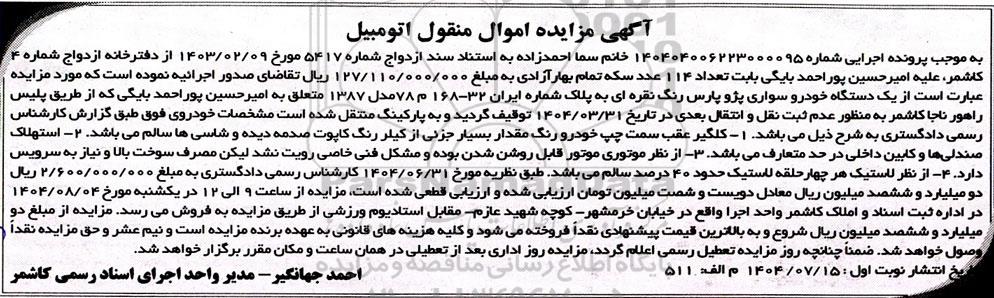 به موجب پرونده اجرایی شماره 140404006223000095 خانم سما احمدزاده به استناد سند ازدواج شماره 5417 مورخ 1403.02.09 از دفترخانه ازدواج شماره 4 کاشمر، علیه امیر حسین پور احمد بایگی بابت تعداد 114 عدد سکه تمام بهار آزادی به مبلغ 127.110.000.000 ریال تقاضای صدور اجرائیه نموده است که مورد مزایده عبارت است از یک دستگاه خودرو سواری پژو پارس رنگ نقره ای به پلاک شماره ایران 32-168 م 78 مدل 1387 متعلق به امیر حسین پور احمد بایگی که از طریق پلیس راهور ناجا کاشمر به منظور عدم ثبت نقل و انتقال بعدی در تاریخ 1404.03.31 توقیف گردید و به پارکینگ منتقل شده است مشخصات خودروی فوق طبق گزارش کارشناس رسمی دادگستری به شرح ذیل میباشد. 1- کلگیر عقب سمت چپ خودرو رنگ مقدار بسیار جزئی از کیلر رنگ کاپوت صدمه دیده و شاسی ها سالم می باشد. 2- استهلاک صندلیها و کابین داخلی در حد متعارف میباشد. 3- از نظر موتوری موتور قابل روشن شدن بوده و مشکل فنی خاصی رویت نشد لیکن مصرف سوخت بالا و نیاز به سرویس دارد. 4- از نظر لاستیک هر چهار حلقه لاستیک حدود 40 درصد سالم میباشد. طبق نظریه مورخ 1404.06.31 کارشناس رسمی دادگستری به مبلغ 2.600.000.000 ریال دو میلیارد و ششصد میلیون ریال معادل دویست و شصت میلیون تومان ارزیابی شده و ارزیابی قطعی شده است مزایده از ساعت 9 الی 12 در یکشنبه مورخ 1404.08.04 در اداره ثبت اسناد و املاک کاشمر واحد اجرا واقع در خیابان خرمشهر - کوچه شهید عازم مقابل استادیوم ورزشی از طریق مزایده به فروش میرسد. مزایده از مبلغ دو میلیارد و ششصد میلیون ریال شروع و به بالاترین قیمت پیشنهادی نقداً فروخته میشود و کلیه هزینه های قانونی به عهده برنده مزایده است و نیم عشر و حق مزایده نقداً وصول خواهد شد. ضمناً چنانچه روز مزایده تعطیل رسمی اعلام گردد مزایده روز اداری بعد از تعطیلی در همان ساعت و مکان مقرر برگزار خواهد شد. اريخ انتشار نوبت اول : 1404.07.15 م الفه 511
