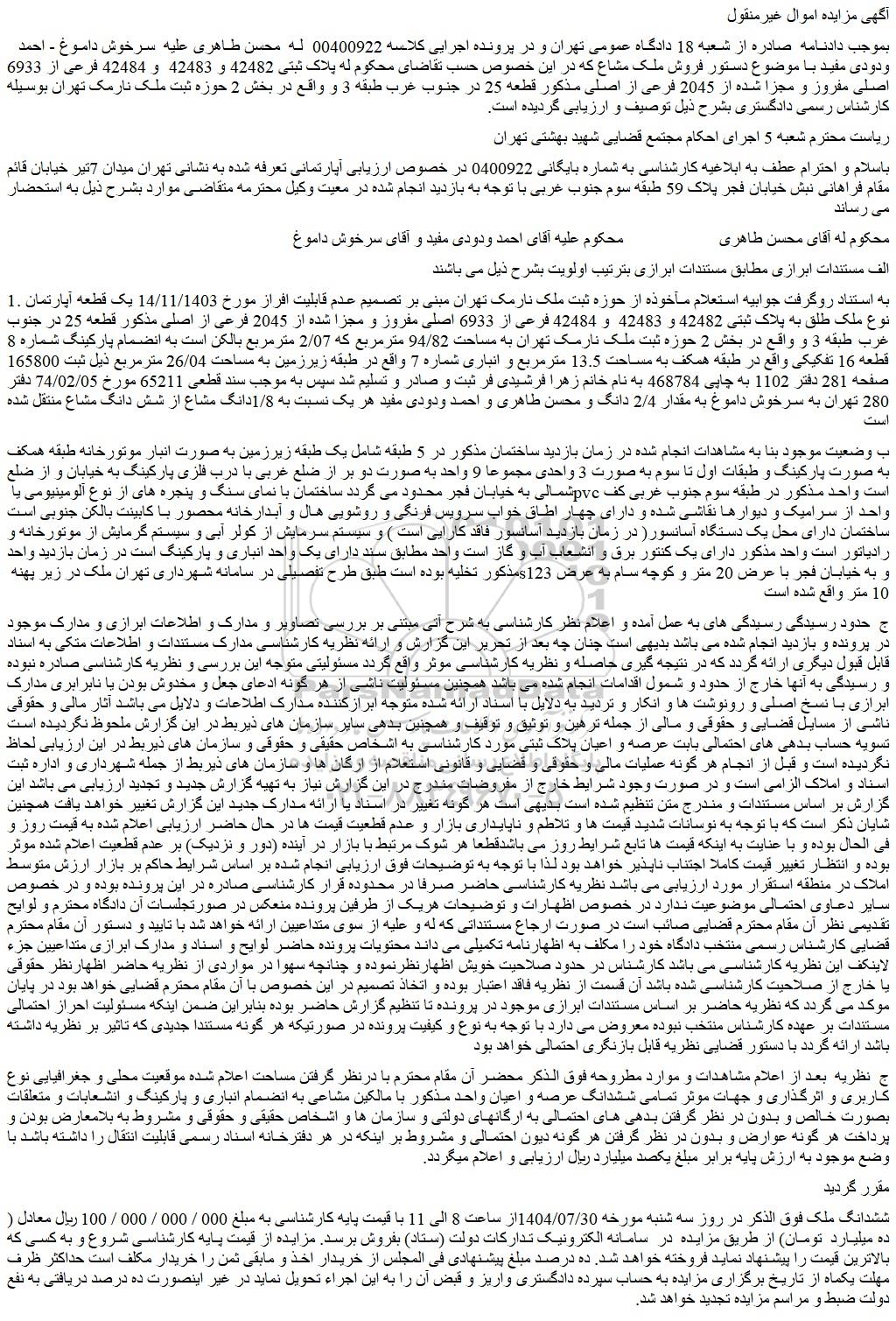 بموجب دادنامه صادره از شعبه 18 دادگاه عمومی تهران و در پرونده اجرایی کلاسه 00400922 له محسن طاهری علیه سرخوش داموغ - احمد ودودی مفید با موضوع دستور فروش ملک مشاع که در این خصوص حسب تقاضای محکوم له پلاک ثبتی 42482 و 42483 و 42484 فرعی از 6933 اصلی مفروز و مجزا شده از 2045 فرعی از اصلی مذکور قطعه 25 در جنوب غرب طبقه 3 و واقع در بخش 2 حوزه ثبت ملک نارمک تهران بوسیله کارشناس رسمی دادگستری بشرح ذیل توصیف و ارزیابی گردیده است.