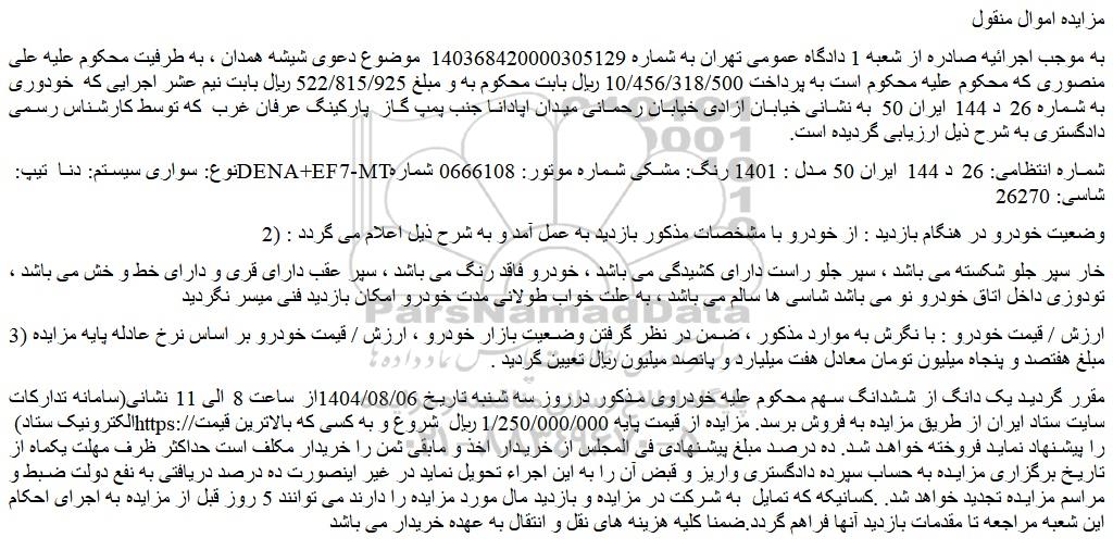 به موجب اجرائیه صادره از شعبه 1 دادگاه عمومی تهران به شماره 140368420000305129  موضوع دعوی شیشه همدان ، به طرفیت محکوم علیه علی منصوری که محکوم علیه محکوم است به پرداخت 10/456/318/500 ریال بابت محکوم به و مبلغ 522/815/925 ریال بابت نیم عشر اجرایی که  خودوری به شماره 26 د 144 ایران 50  به نشانی خیابان ازادی خیابان رحمانی میدان اپادانا جنب پمپ گاز  پارکینگ عرفان غرب  که توسط کارشناس رسمی دادگستری به شرح ذیل ارزیابی گردیده است.‎