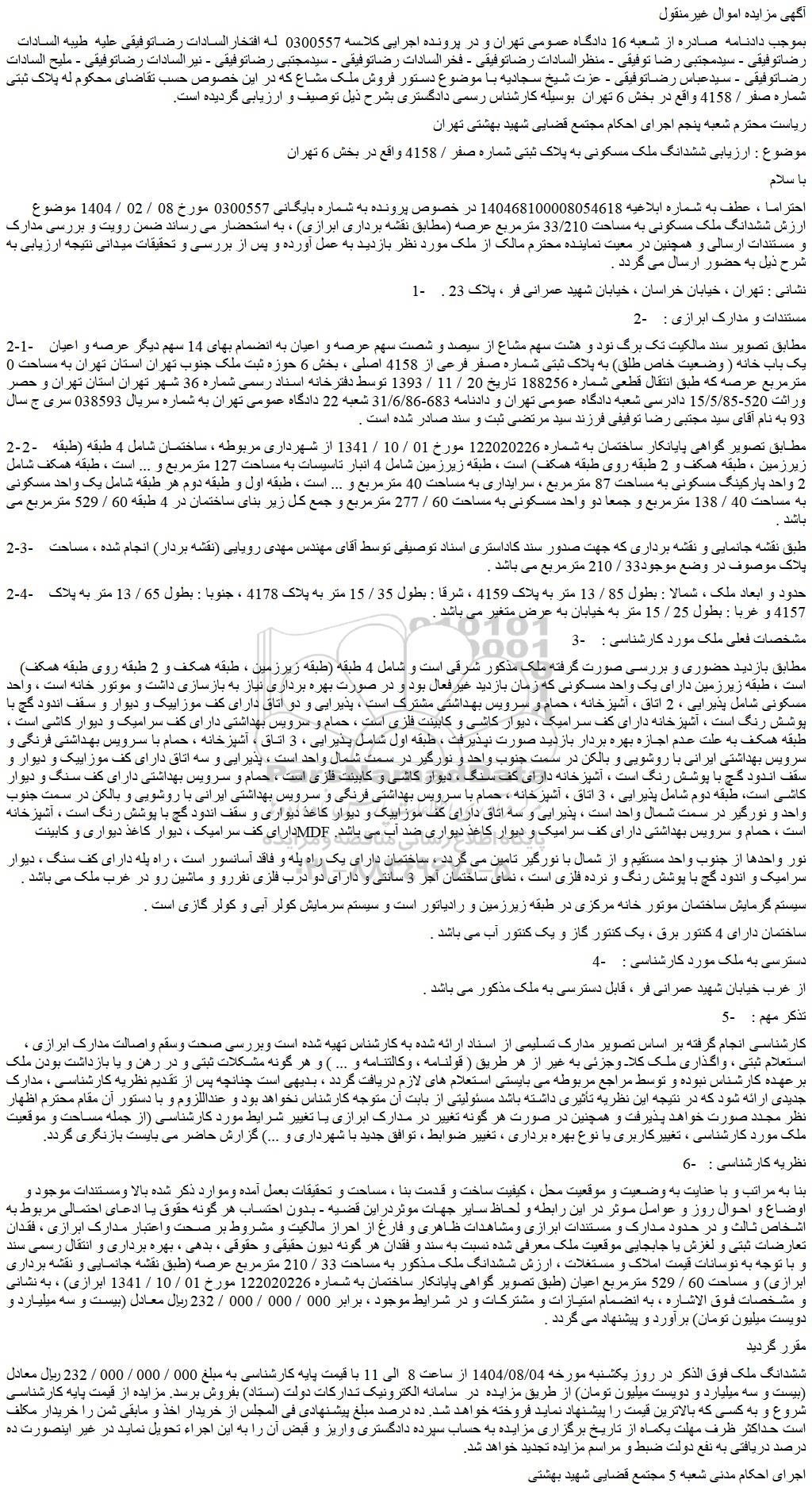 بموجب دادنامه صادره از شعبه 16 دادگاه عمومی تهران و در پرونده اجرایی کلاسه 0300557 له افتخارالسادات رضاتوفیقی علیه طیبه السادات رضاتوفیقی - سیدمجتبی رضا توفیقی - منظرالسادات رضاتوفیقی - فخرالسادات رضاتوفیقی - سیدمجتبی رضاتوفیقی - نیرالسادات رضاتوفیقی - ملیح السادات رضاتوفیقی - سیدعباس رضاتوفیقی - عزت شیخ سجادیه با موضوع دستور فروش ملک مشاع که در این خصوص حسب تقاضای محکوم له پلاک ثبتی شماره صفر / 4158 واقع در بخش 6 تهران بوسیله کارشناس رسمی دادگستری بشرح ذیل توصیف و ارزیابی گردیده است.