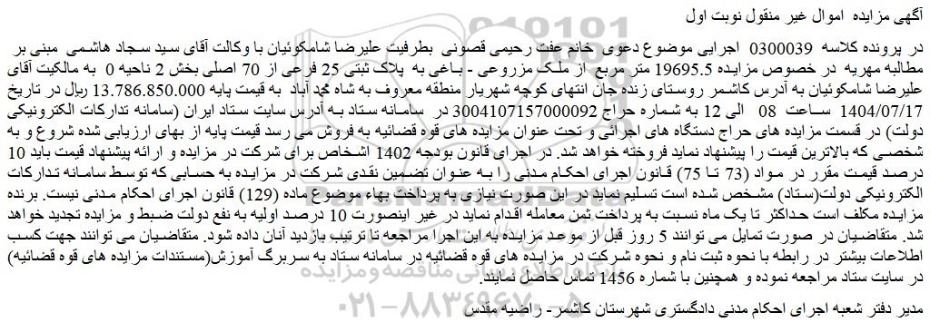 در پرونده کلاسه 0300039 اجرایی موضوع دعوی خانم عفت رحیمی قصونی بطرفیت علیرضا شامکوئیان با وکالت آقای سید سجاد هاشمی مبنی بر مطالبه مهریه در خصوص مزایده 19695.5 متر مربع از ملک مزروعی - باغی به پلاک ثبتی 25 فرعی از 70 اصلی بخش 2 ناحیه 0 به مالکیت آقای علیرضا شامکوئیان به آدرس کاشمر روستای زنده جان انتهای کوچه شهریار منطقه معروف به شاه محمد آباد به قیمت پایه 13.786.850.000 ریال در تاریخ 1404/07/17 ساعت 08 الی 12 به شماره حراج 3004107157000092 در سامانه ستاد به آدرس سایت ستاد ایران (سامانه تدارکات الکترونیکی دولت) در قسمت مزایده های حراج دستگاه های اجرائی و تحت عنوان مزایده های قوه قضائیه به فروش می رسد قیمت پایه از بهای ارزیابی شده شروع و به شخصی که بالاترین قیمت را پیشنهاد نماید فروخته خواهد شد. در اجرای قانون بودجه 1402 اشخاص برای شرکت در مزایده و ارائه پیشنهاد قیمت باید 10 درصد قیمت مقرر در مواد (73 تا 75) قانون اجرای احکام مدنی را به عنوان تضمین نقدی شرکت در مزایده به حسابی که توسط سامانه تدارکات الکترونیکی دولت(ستاد) مشخص شده است تسلیم نماید در این صورت نیازی به پرداخت بهاء موضوع ماده (129) قانون اجرای احکام مدنی نیست. برنده مزایده مکلف است حداکثر تا یک ماه نسبت به پرداخت ثمن معامله اقدام نماید در غیر اینصورت 10 درصد اولیه به نفع دولت ضبط و مزایده تجدید خواهد شد. متقاضیان در صورت تمایل می توانند 5 روز قبل از موعد مزایده به این اجرا مراجعه تا ترتیب بازدید آنان داده شود. متقاضیان می توانند جهت کسب اطلاعات بیشتر در رابطه با نحوه ثبت نام و نحوه شرکت در مزایده های قوه قضائیه در سامانه ستاد به سربرگ آموزش(مستندات مزایده های قوه قضائیه) در سایت ستاد مراجعه نموده و همچنین با شماره 1456 تماس حاصل نمایند.