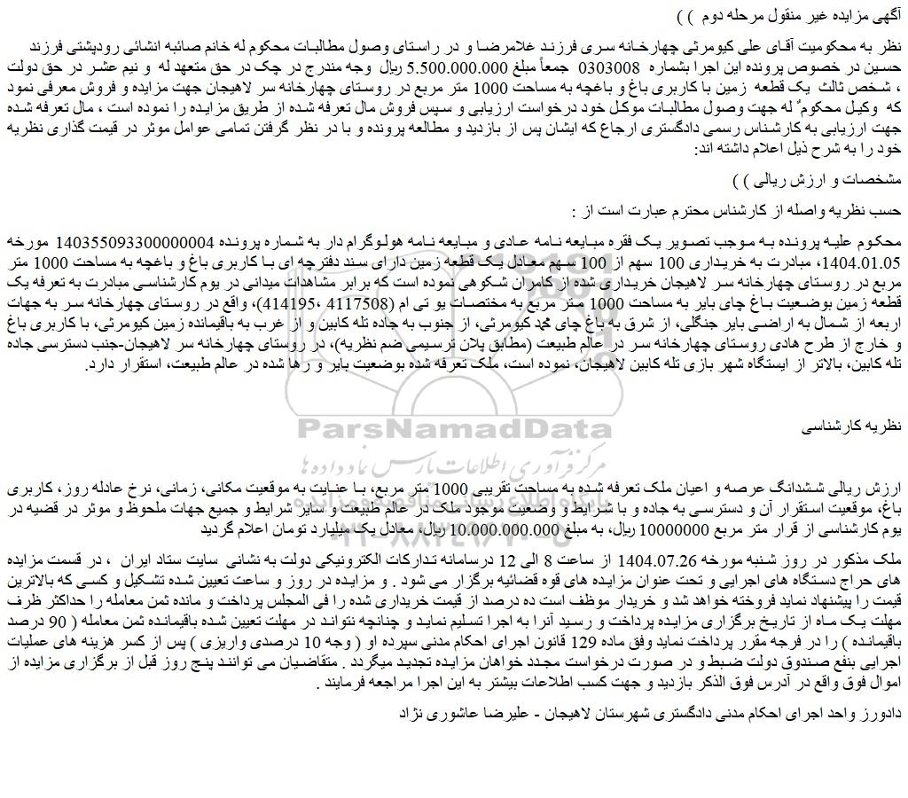 نظر به محکومیت آقای علی کیومرثی چهارخانه سری فرزند غلامرضا و در راستای وصول مطالبات محکوم له خانم صائبه انشائی رودپشتی فرزند حسین در خصوص پرونده این اجرا بشماره  0303008  جمعاً مبلغ 5.500.000.000 ریال  وجه مندرج در چک در حق متعهد له  و نیم عشر در حق دولت ، شخص ثالث  یک قطعه  زمین با کاربری باغ و باغچه به مساحت 1000 متر مربع در روستای چهارخانه سر لاهیجان جهت مزایده و فروش معرفی نمود که  وکیل محکوم ٌ له جهت وصول مطالبات موکل خود درخواست ارزیابی و سپس فروش مال تعرفه شده از طریق مزایده را نموده است ، مال تعرفه شده جهت ارزیابی به کارشناس رسمی دادگستری ارجاع که ایشان پس از بازدید و مطالعه پرونده و با در نظر گرفتن تمامی عوامل موثر در قیمت گذاری نظریه خود را به شرح ذیل اعلام داشته اند: