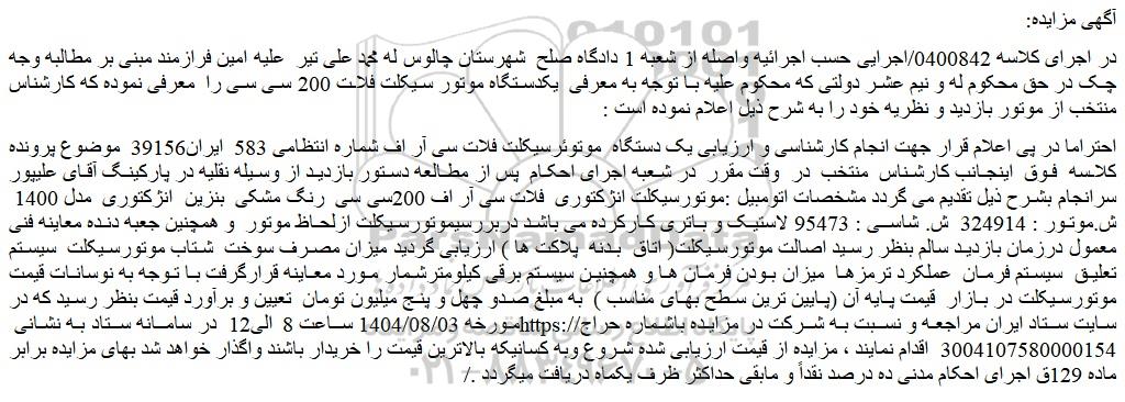احتراما در پی اعلام قرار جهت انجام کارشناسی و ارزیابی یک دستگاه  موتوئرسیکلت فلات سی آر اف شماره انتظامی 583  ایران39156  موضوع پرونده کلاسه  فوق  اینجانب کارشناس  منتخب  در  وقت مقرر  در شعبه اجرای احکام  پس از مطالعه دستور بازدید از وسیله نقلیه در پارکینگ آقای علیپور سرانجام بشرح ذیل تقدیم می گردد مشخصات اتومبیل :موتورسیکلت انژکتوری  فلات سی آر اف 200سی سی  رنگ مشکی  بنزین  انژکتوری  مدل 1400  ش.موتور : 324914  ش. شاسی : 95473 لاستیک و باتری کارکرده می باشد دربررسیموتورسیکلت ازلحاظ موتور  و همچنین جعبه دنده معاینه فنی معمول درزمان بازدید سالم بنظر رسید اصالت موتورسیکلت( اتاق  بدنه  پلاکت ها ) ارزیابی گردید میزان مصرف سوخت  شتاب موتورسیکلت  سیستم تعلیق  سیستم فرمان  عملکرد ترمزها  میزان بودن فرمان ها و همچنین سیستم برقی کیلومترشمار مورد معاینه قرارگرفت با توجه به نوسانات قیمت موتورسیکلت در بازار  قیمت پایه آن (پایین ترین سطح بهای مناسب )  به مبلغ صدو چهل و پنج میلیون تومان  تعیین و برآورد قیمت بنظر رسید که در مورخه 1404/08/03 ساعت 8 الی12  در سامانه ستاد به نشانی سایت ستاد ایران مراجعه و نسبت به شرکت در مزایده باشماره حراج 3004107580000154  اقدام نمایند ، مزایده از قیمت ارزیابی شده شروع وبه کسانیکه بالاترین قیمت را خریدار باشند واگذار خواهد شد بهای مزایده برابر ماده 129ق اجرای احکام مدنی ده درصد نقداً و مابقی حداکثر ظرف یکماه دریافت میگردد ./