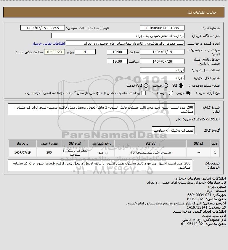 استعلام 200 عدد تست اسپور رپید مورد تائید مسئول بخش تسویه 3 ماهه تحویل درمحل پیش فاکتور ضمیمه شود ایران کد مشابه میباشد., استعلام 200 عدد تست اسپور رپید مورد تائید مسئول بخش تسویه 3 ماهه تحویل درمحل پیش فاکتور ضمیمه شود ایران کد مشابه میباشد.