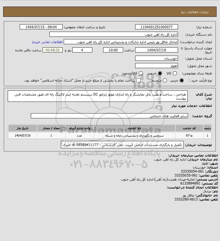 شرح کلی نیاز: طراحی ، ساخت و نصب پانل نمایشگر و راه اندازی موتور ژنراتور DC سیستم تغذیه اینتر لاکینگ رله ای طبق مشخصات فنی پیوست