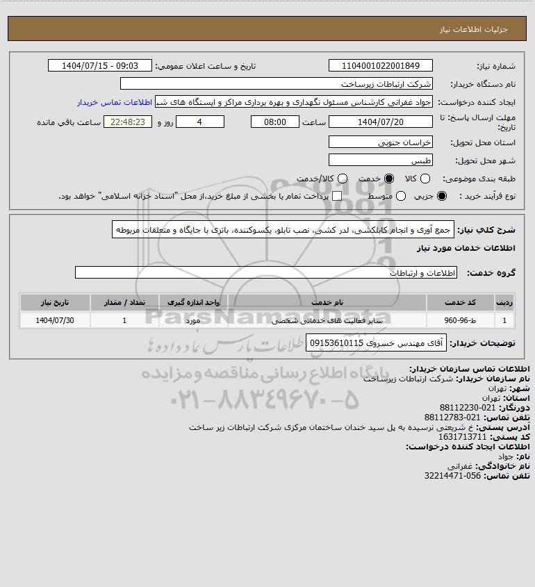 شرح کلی نیاز: جمع آوری و انجام کابلکشی، لدر کشی، نصب تابلو، یکسوکننده، باتری با جایگاه و متعلقات مربوطه