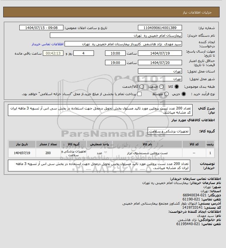 استعلام تعداد 200 عدد تست پروتئین مورد تائید مسئول بخش تحویل درمحل جهت استفاده در بخش سی اس آر تسویه 3 ماهه ایران کد مشابه میباشد., استعلام تعداد 200 عدد تست پروتئین مورد تائید مسئول بخش تحویل درمحل جهت استفاده در بخش سی اس آر تسویه 3 ماهه ایران کد مشابه میباشد.