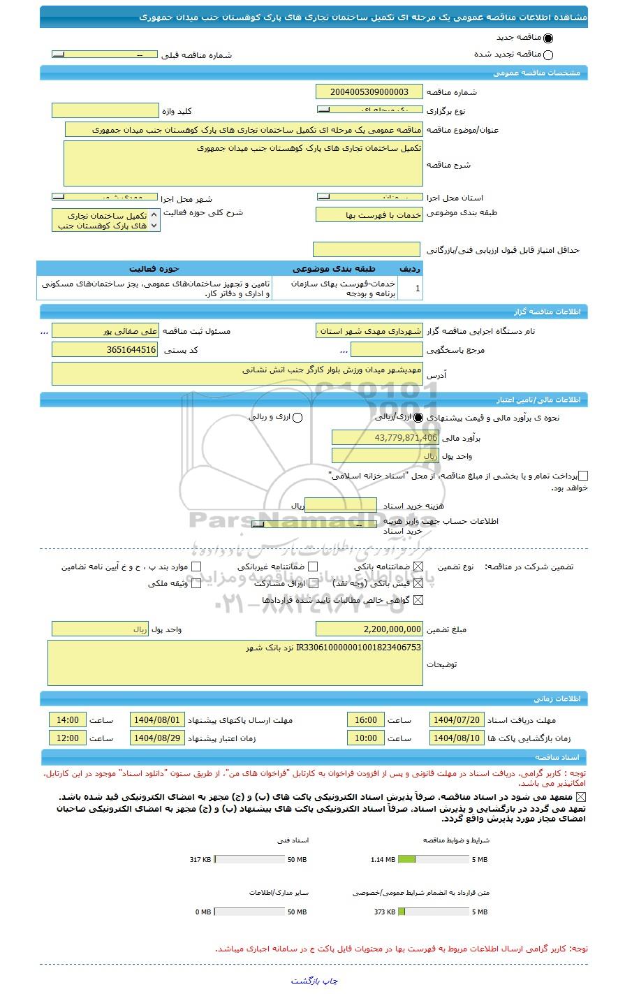 | شرح مناقصه | تکمیل ساختمان تجاری های پارک کوهستان جنب میدان جمهوری | ||||||||