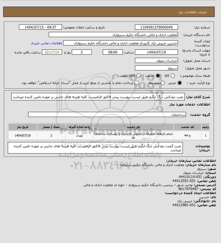 توضیحات خریدار:نصب 2عدد دودکش دیگ ابگرم طبق لیست پیوست پیش فاکتور الزامیست کلیه هزینه های جانبی بر عهده تامین کننده میباشد