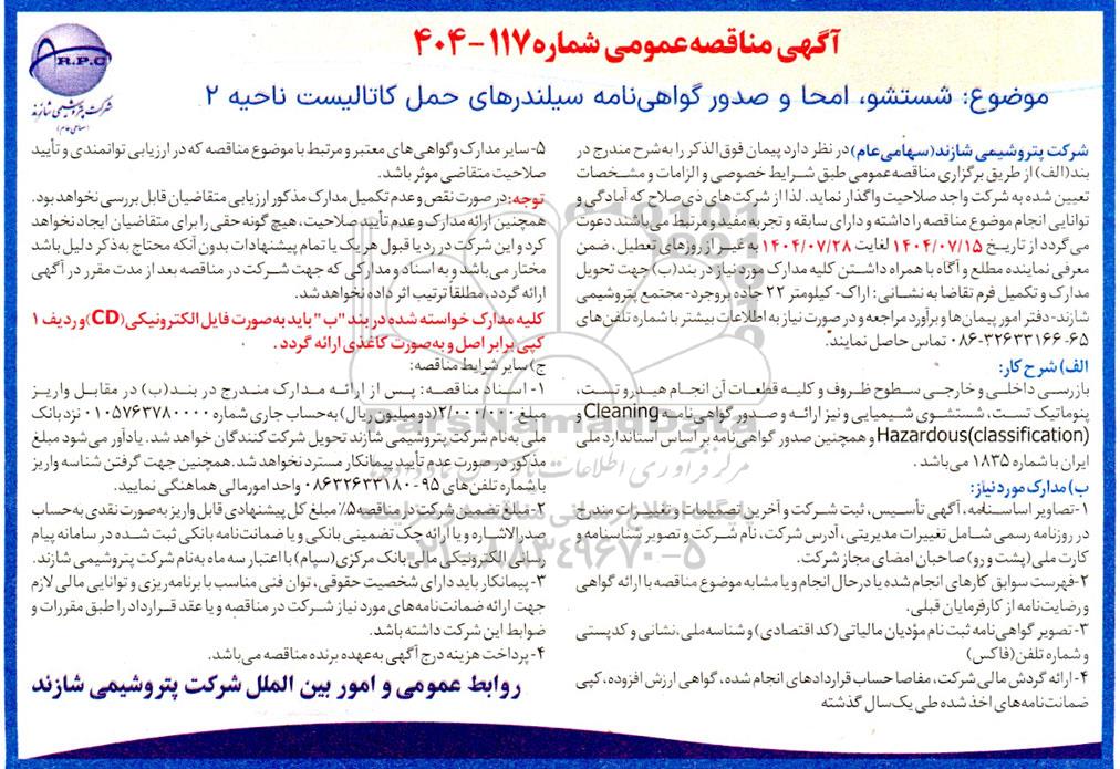 مناقصه شستشو ، امحا و صدور گواهی نامه سیلندرهای حمل کاتالیست از کلیه افراد متخصص و شرکتها واجد شرایط دعوت به عمل میآید در مناقصه با کد خبرگزاری پارس نماد: 9659744 شرکت نمایند.