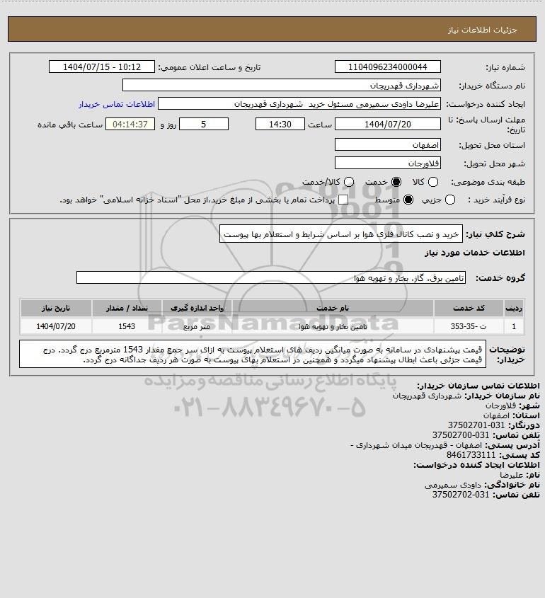 شرح کلی نیاز: خرید و نصب کانال فلزی هوا بر اساس شرایط و استعلام بها پیوست