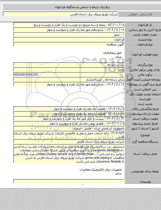 ۱۴۰۴۱۹۴۳ ارائه خدمات حمل و نقل و جابجایی کارکنان شرکت توزیع نیروی برق استان فارس