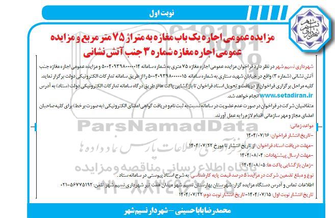 مزایده عمومی اجاره یک باب مغازه به متراژ 75 مترمربع و مزایده عمومی اجاره مغازه شماره 3 جنب آتش نشانی ؟ نوبت اول