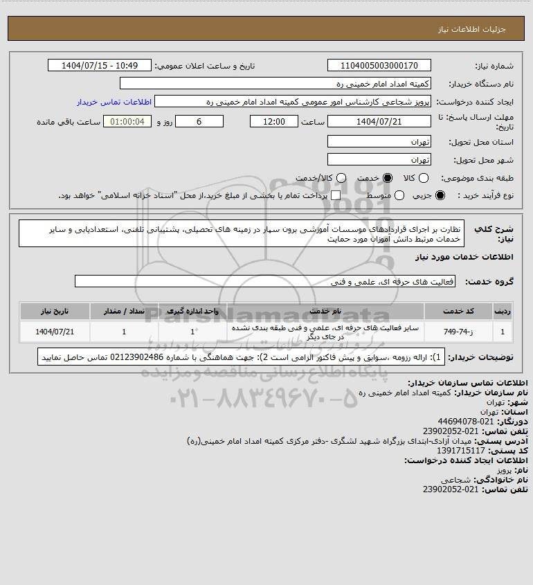 شرح کلی نیاز: نظارت بر اجرای قراردادهای موسسات آموزشی برون سپار در زمینه های تحصیلی، پشتیبانی تلفنی، استعدادیابی و سایر خدمات مرتبط دانش آموزان مورد حمایت