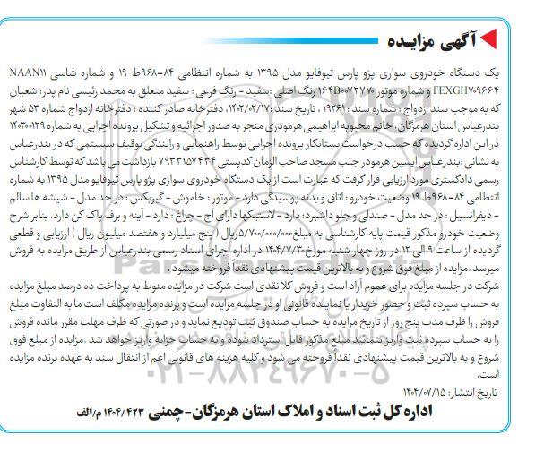 یک دستگاه خودروی سواری پژو پارس تیوفایو مدل 1395 به شماره انتظامی 84-968 ط 19 و شماره شاسی NAAN11 FEXGH709664 و شماره موتور 1640072770 رنگ اصلی سفید - رنگ فرعی: سفید متعلق به محمد رئیسی نام پدر شعبان که به موجب سند ازدواج : شماره سند : 19261 ، تاریخ سند : 1402.02.17 ، دفترخانه صادر کننده : دفترخانه ازدواج شماره 53 شهر بندر عباس استان هرمزگان خانم محبوبه ابراهیمی هر مودری منجر به صدور اجرائیه و تشکیل پرونده اجرایی به شماره 140300129 در این اداره گردیده که حسب درخواست بستانکار پرونده اجرایی توسط راهنمایی و رانندگی توقیف سیستمی که در بندر عباس به نشانی بندر عباس ایسین هر مو در جنب مسجد صاحب الزمان کدپستی 7933157434 بازداشت میباشد که توسط کارشناس رسمی دادگستری مورد ارزیابی قرار گرفت که عبارت است از یک دستگاه خودروی سواری پژو پارس تیوفایو مدل 1395 به شماره انتظامی 84 - 968 ط 19 وضعیت خودرو اتاق و بدنه پوسیدگی دارد - موتور خاموش - گیربکس : در حد مدل - شیشه ها سالم دیفرانسیل : در حد مدل - صندلی و جلو داشبرد دارد - لاستیکها دارای آج - چراغ دارد - اینه و برف پاک کن دارد. بنابر شرح وضعیت خودرو مذکور قیمت پایه کارشناسی به مبلغ 5.700.000.000 ریال ( پنج میلیارد و هفتصد میلیون ریال ) ارزیابی و قطعی گردیده از ساعت 9 الی 12 در روز چهار شنبه مورخ 1404.7.30 در اداره اجرای اسناد رسمی بندر عباس از طریق مزایده به فروش میرسد. مزایده از مبلغ فوق شروع و به بالاترین قیمت پیشنهادی نقدا فروخته میشود.