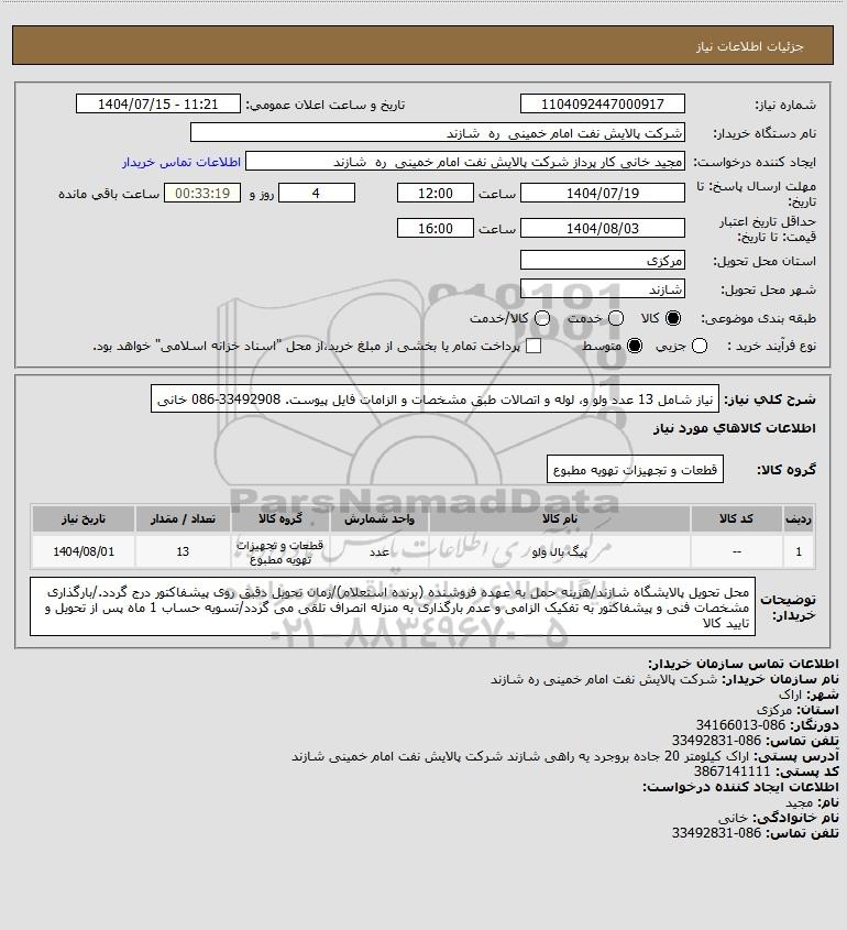 شرح کلی نیاز: نیاز شامل 13 عدد ولو و، لوله و اتصالات طبق مشخصات و الزامات فایل پیوست. 33492908-086 خانی