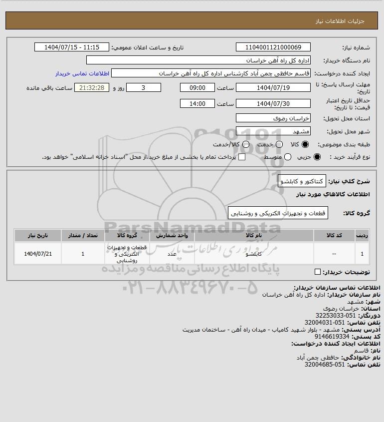 | 1 | -- | کابلشو | عدد | قطعات و تجهیزات الکتریکی و روشنایی | 1 | 1404/07/21 |