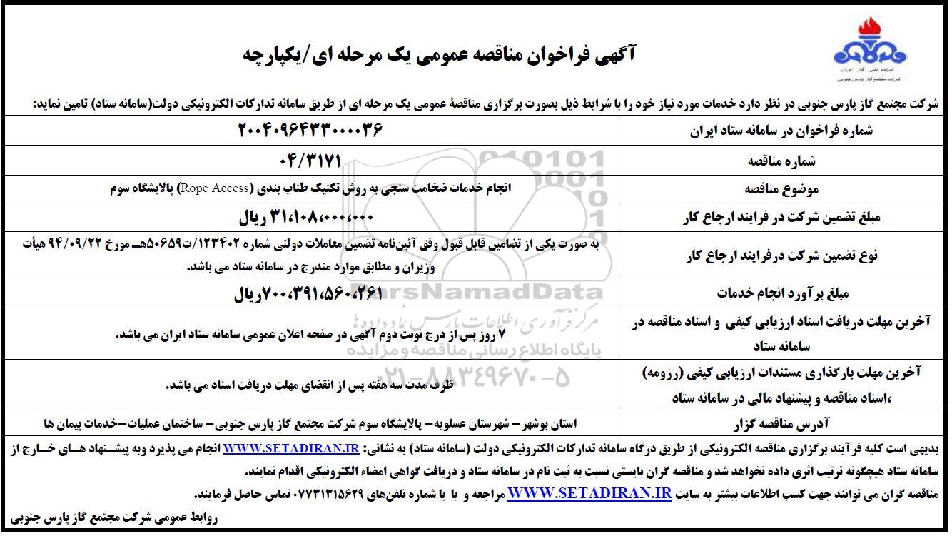 شرکت مجتمع گاز پارس جنوبی در نظر دارد خدمات مورد نیاز خود را با شرایط ذیل به صورت برگزاری مناقصه عمومی یک مرحله ای از طریق سامانه تدارکات الکترونیکی دولت (سامانه ستاد) تامین نماید: