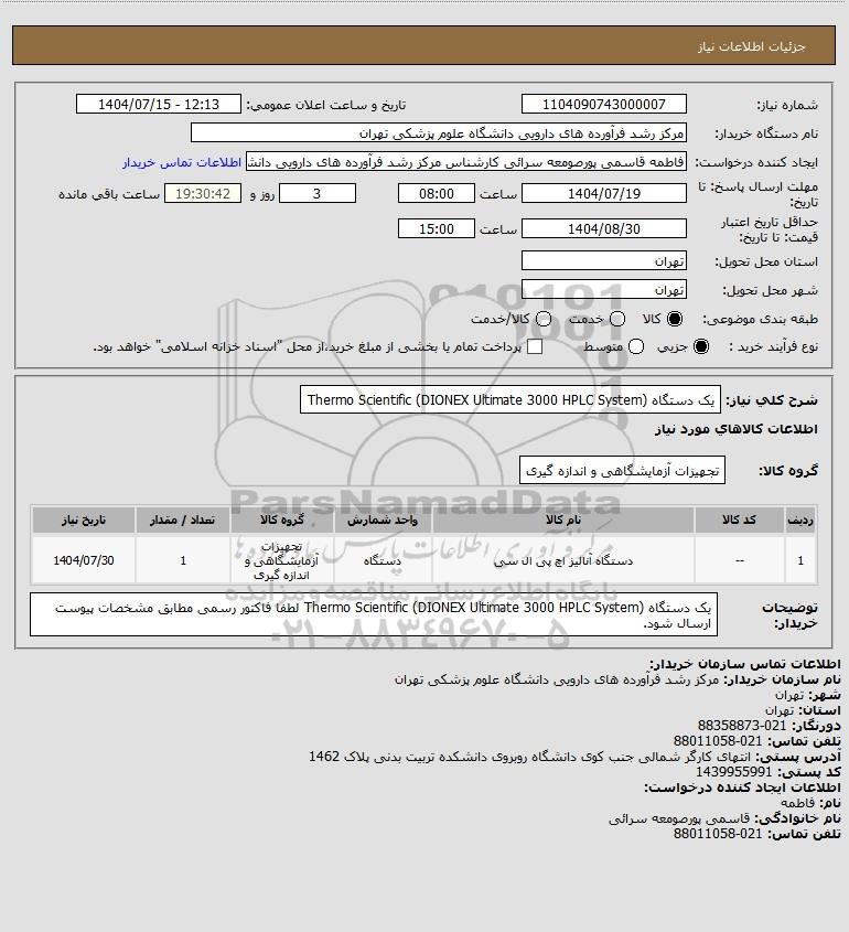 توضیحات خریدار: ﯾﮏ دﺳﺘﮕﺎه (Thermo Scientific (DIONEX Ultimate 3000 HPLC System لطفا فاکتور رسمی مطابق مشخصات پیوست ارسال شود.