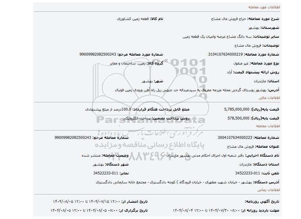 | شرح مورد معامله: حراج فروش مال مشاع | نام کالا: قطعه زمین کشاورزی | |