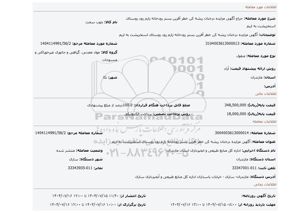 توضیحات: آگهی مزایده درختان ریشه کن خطر آفرین بستر رودخانه زارم رود روستای استخرپشت به اریم
