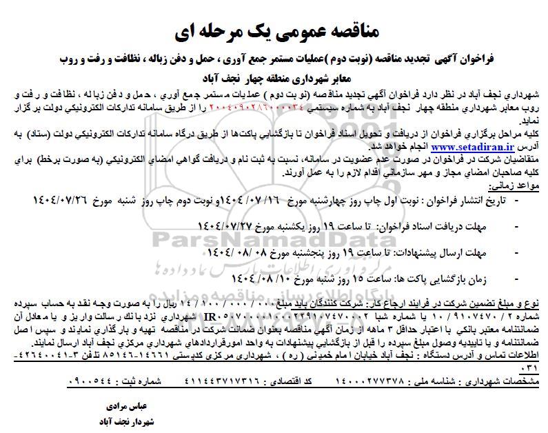 شهرداری نجف آباد در نظر دارد فراخوان نوبت دوم تجدید آگهی مناقصه عمليات مستمر جمع آوری ، حمل و دفن زباله ، نظافت و رفت و روب معابر شهرداری منطقه چهار نجف آباد به شماره سيستمی 2004090286000034 را از طریق سامانه تداركات الكترونيكي دولت برگزار نماید. کلیه مراحل برگزاری فراخوان از دریافت و تحویل اسناد فراخوان تا بازگشایی پاکتها از طریق درگاه سامانه تداركات الكترونيكي دولت (ستاد) به آدرس ستاد ایران انجام خواهد شد