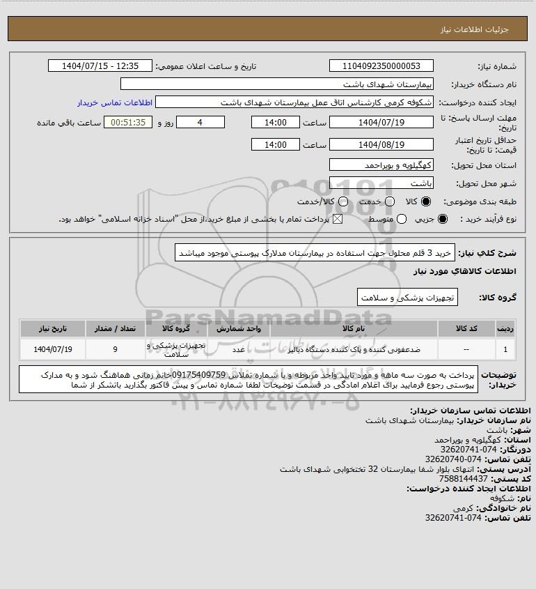 | 1 | -- | ضدعفونی کننده و پاک کننده دستگاه دیالیز | عدد | تجهیزات پزشکی و سلامت | 9 | 1404/07/19 |