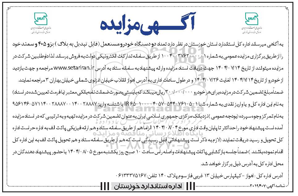 به آگاهی میرساند اداره کل استاندارد استان خوزستان در نظر دارد تعداد دو دستگاه خودرو مستعمل (قابل تبدیل به پلاک ) پژو 405 و سمند خود را از طریق برگزاری مزایده عمومی به شماره 1004003762000001 از طریق سامانه تدارکات الکترونیکی دولت به فروش برساند. لذا داوطلبین شرکت در مزایده میتواند از تاریخ 1404.07.14 جهت دریافت اسناد مزایده و ارائه پیشنهاد به سامانه ستاد به آدرس ستاد ایران مراجعه و جهت بازدید از خودرو از تاریخ 1404.7.14 لغایت 1404.07.26 و در طول ساعات اداری به آدرس اهواز انقلاب خیابان غزنوی شملی خیابان بهاران 3 مراجعه نمایند.
