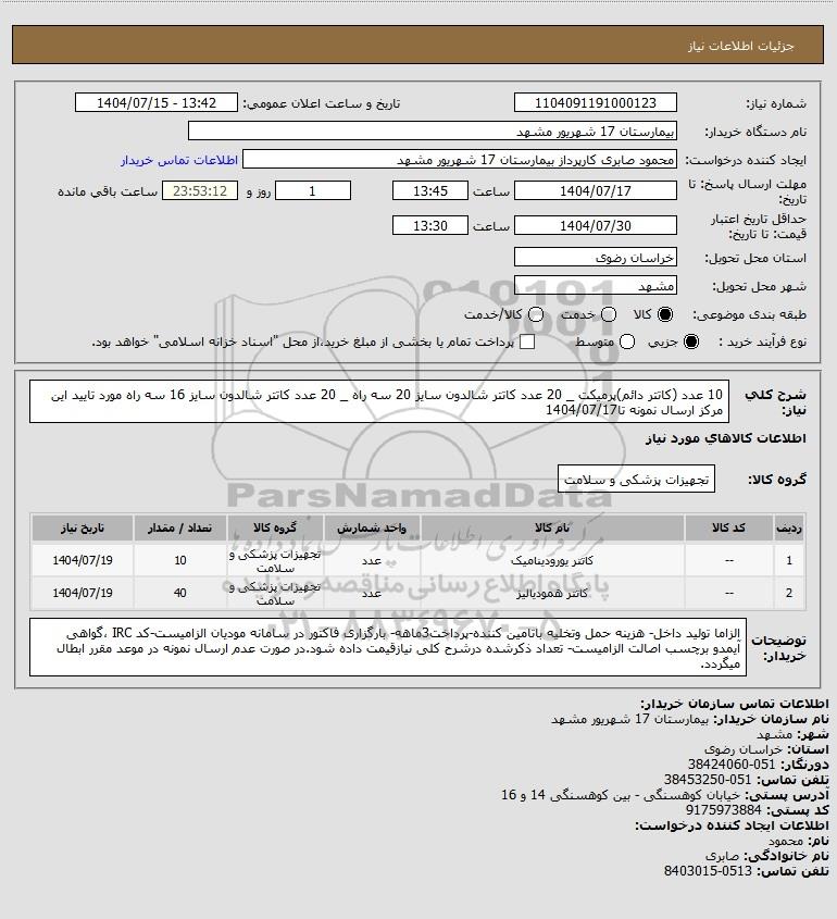 | 1 | -- | کاتتر یورودینامیک | عدد | تجهیزات پزشکی و سلامت | 10 | 1404/07/19 |