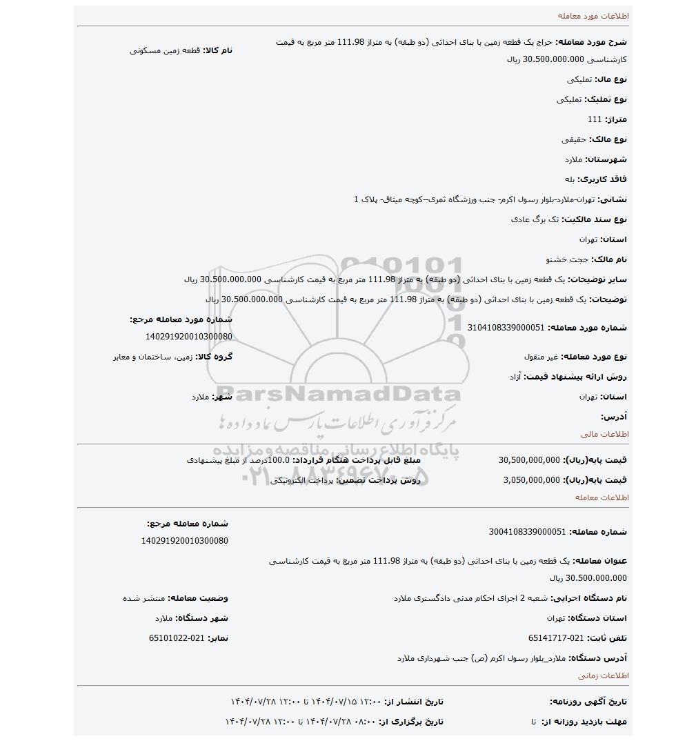 | سایر توضیحات: یک قطعه زمین با بنای احداثی (دو طبقه) به متراژ 111.98 متر مربع به قیمت کارشناسی 30.500.000.000 ریال | ||