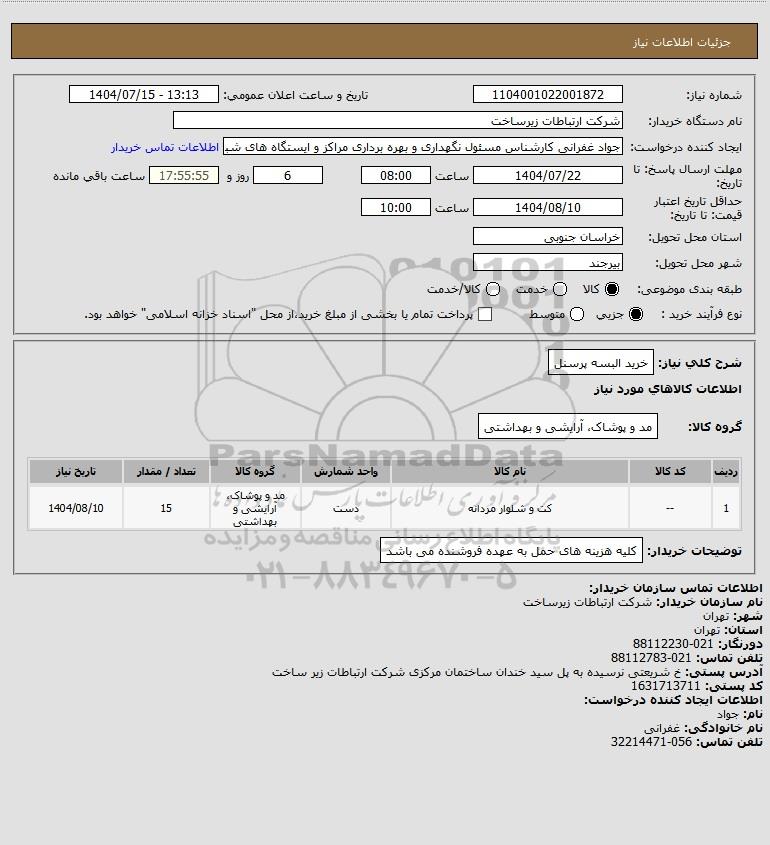 استعلام خرید البسه پرسنل, استعلام خرید البسه پرسنل