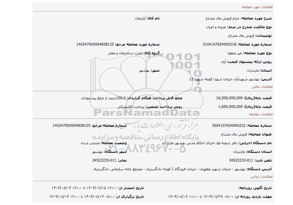 | شرح مورد معامله: حراج فروش مال مشاع | نام کالا: آپارتمان | |