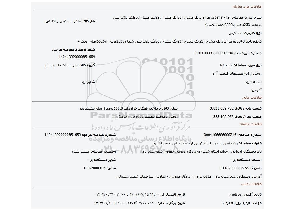 | عنوان معامله: پلاک ثبتی شماره 2531 فرعی از 6526 اصلی بخش 04 یزد | ||