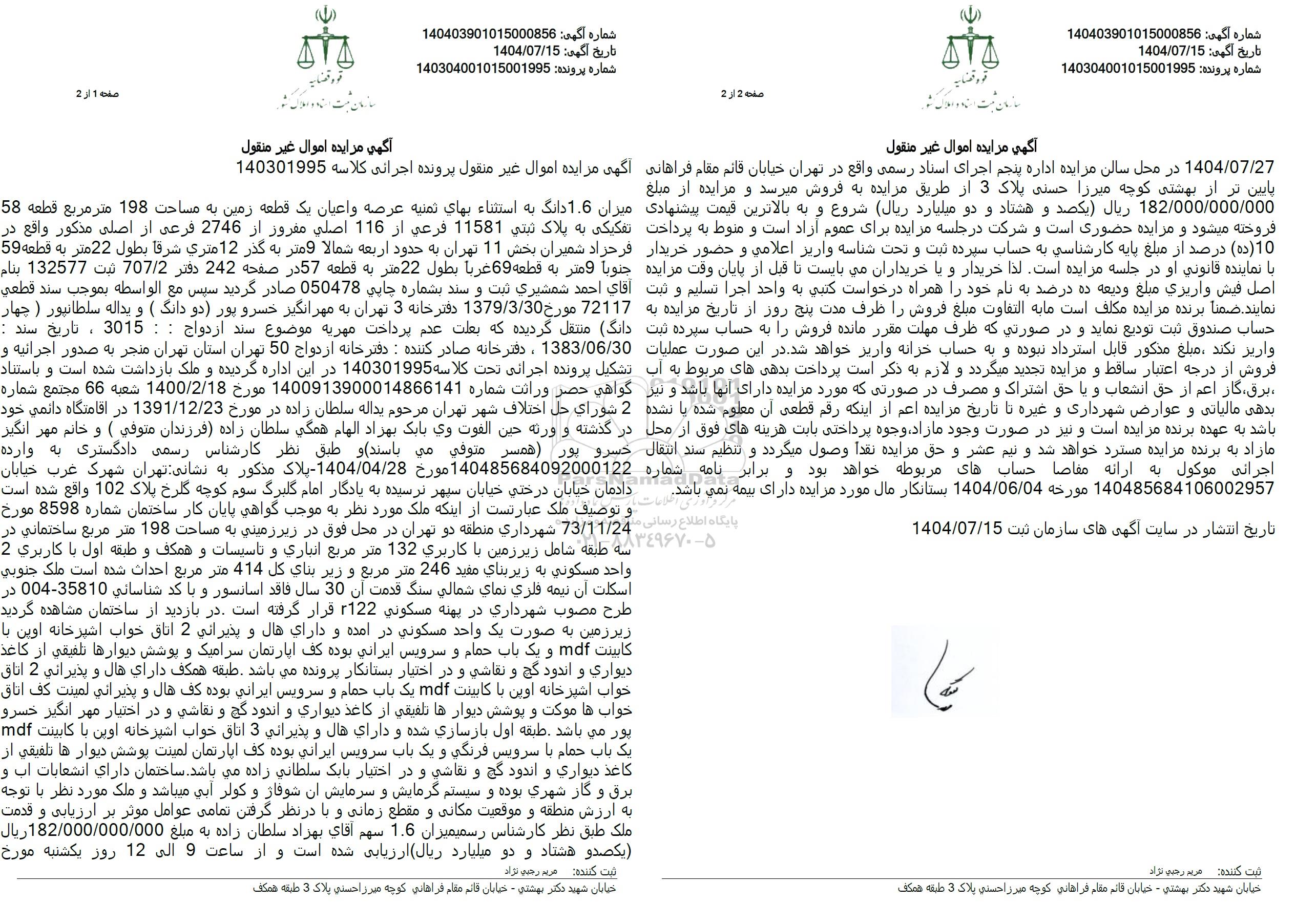 میزان 1.6 دانگ به استثناء بهای ثمنیه عرصه و اعیان یک قطعه زمین به مساحت 198 متر مربع قطعة 58 تفکیکی به پلاک ثبتی 11581 فرعی از 116 اصلی مفرور از 2746 فرعی از اصلی مذکور واقع در فرحزاد شمیران بخش 11 تهران به حدود اربعه شمالا 9 متر به گذر 12 متری شرقاً بطول 22 متر به قطعه 59 جنوباً 9 متر به قطعه 69 غربا بطول 22 متر به قطعه 57 در صفحه 242 دفتر 707.2 ثبت 132577 بنام آقای احمد شمشیری ثبت و سند بشماره چاپی 050478 صادر گردید سپس مع الواسطة بموجب سند قطعی 72117 مورخ 1379.3.30 دفترخانه 3 تهران به مهرانگیز خسرو پور (دو دانگ ) و یداله سلطانپور (چهار دانگ) منتقل گردیده که بعلت عدم پرداخت مهریه موضوع سند ازدواج : : 3015 ، تاریخ سند : 1383.06.30 ، دفترخانه صادر کننده : دفترخانه ازدواج 50 تهران استان تهران منجر به صدور اجرائیه و تشکیل پرونده اجرائی تحت کلاسه 140301995 در این اداره گردیده و ملک بازداشت شده است و باستناد گواهی حصر وراثت شماره 1400913900014866141 مورخ 1400.2.18 شعبه 66 مجتمع شماره 2 شورای حل اختلاف شهر تهران مرحوم بداله سلطان زاده در مورخ 1391.12.23 در اقامتگاه دائمی خود در گذشته و ورثه حین الفوت وی بابک بهزاد الهام همگی سلطان زاده (فرزندان متوفی) و خانم مهر انگیر خسرو پور (همسر متوفی می باسند) و طبق نظر کارشناس رسمی دادگستری به وارده 140485684092000122 مورخ 1404.04.28 - پلاک مذکور به نشانی تهران شهرک غرب خیابان دادمان خیابان درختی خیابان سپهر نرسیده به یادگار امام گلبرگ سوم کوچه گلرخ پلاک 102 واقع شده است. و توصیف ملک عبارتست از اینکه ملک مورد نظر به موجب گواهی پایان کار ساختمان شماره 8598 مورخ 73.11.24 شهرداری منطقه دو تهران در محل فوق در زیر زمینی به مساحت 198 متر مربع ساختمانی در سه طبقه شامل زیر زمین با کاربری 132 متر مربع تیاری و تاسیسات و همکف و طبقه اول با کاربری 2 واحد مسکونی به زیربنای مفید 246 متر مربع و زیر بنای کل 414 متر مربع احداث شده است ملک جنوبی اسکات آن نیمه قلری نمای شمالی سنگ قدمت آن 30 سال فاقد اسانسور و با کد شناسانی 35810-004 در طرح مصوب شهرداری در بهنه مسکونی 1122 قرار گرفته است. در بازدید از ساختمان مشاهده گردید زیرزمین به صورت یک واحد مسکونی در آمده و دارای هال و پذیرانی 2 اتاق خواب اشپزخانه اوین با کابینت mdf و یک باب حمام و سرویس ایرانی بوده کف ایرتمان سرامیک و پوشش دیوارها تلفیقی از کاغذ دیواری و اندود گچ و نقاشی و در اختیار بستانکار پرونده می باشد. طبقه همکف دارای هال و پذیرانی 2 اتاق خواب اشپزخانه اوین با کابینت mdf یک باب حمام و سرویس ایرانی بوده کف هال و پذیرانی لمینت کف اتاق خواب ها موکت و پوشش دیوارها تلفیقی از کاغذ دیواری و اندود گچ و نقاشی و در اختیار مهر انگیر خسرو پور می باشد. طبقه اول بازسازی شده و دارای هال و پذیرائی 3 اتاق خواب اشپزخانه اوین با کابینت mdf یک باب حمام با سرویس فرنگی و یک باب سرویس ایرانی بوده کف آپارتمان لمینت پوشش دیوار ها تلفیقی از کاغذ دیواری و اندود گچ و نقاشی و در اختیار بابک سلطانی زاده می باشد. ساختمان دارای انشعابات آب و برق و کار شهری بوده و سیستم گرمایش و سرمایش آن شوفاژ و کولر آبی میباشد و ملک مورد نظر با توجه به ارزش منطقه و موقعیت مکانی و مقطع زمانی و با در نظر گرفتن تمامی عوامل موثر بر ارزیابی و قدمت ملک طبق نظر کارشناس رسمی میزان 1.6 سهم آقای بهزاد سلطان زاده به مبلغ 182.000.000.000 ریال (یکصد و هشتاد و دو میلیارد ریال) ارزیابی شده است و از ساعت 9 الی 12 روز یکشنبه مورخ 1404.07.27 در محل سالن مزایده اداره پنجم اجرای اسناد رسمی واقع در تهران خیابان قائم مقام فراهانی پایین تر از بهشتی کوچه میرزا حسنی پلاک 3 از طریق مزایده به فروش میرسد و مزایده از مبلغ 182.000.000.000 ریال (یکصد و هشتاد و دو میلیارد ریال) شروع و به بالاترین قیمت پیشنهادی فروخته میشود و مزایده حضوری است و شرکت در جسه مزایده برای عموم آزاد است و منوط به پرداخت 10 (ده) درصد از مبلغ پایه کارشناسی به حساب سپرده ثبت و تحت شناسه واریز اعلامی و حضور خریدار با نماینده قانونی او در جلسه مزایده است. لذا خریدار 