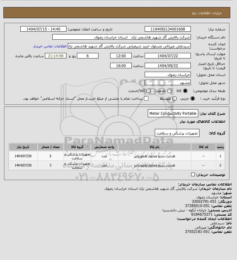 1 -- هدایت سنج محلول همودیالیز عدد تجهیزات پزشکی و سلامت 5 1404/07/30