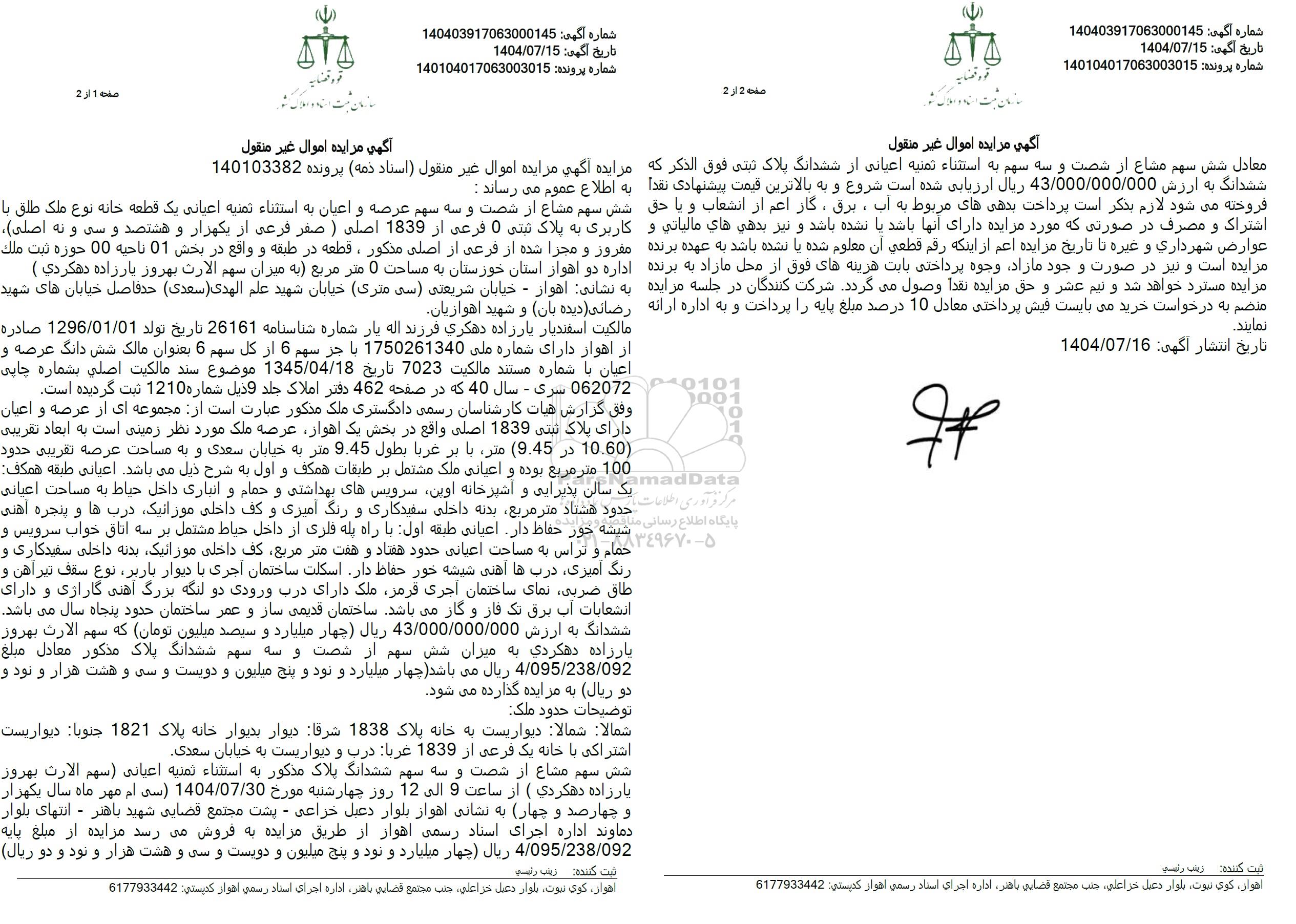 شش سهم مشاع از شصت و سه سهم ششدانگ پلاک مذکور به استثناء ثمنیه اعیانی (سهم الارث بهروز بارزاده دهکردی) از ساعت 9 الی 12 روز چهارشنبه مورخ 1404.07.30 (سی ام مهر ماه سال یکهزار و چهارصد و چهار) به نشانی اهواز بلوار دعبل خزاعی - پشت مجتمع قضایی شهید باهنر - انتهای بلوار دماوند اداره اجرای اسناد رسمی اهواز از طریق مزایده به فروش میرسد مزایده از مبلغ پایه 4.095.238.092 ریال (چهار میلیارد و بود و پنج میلیون و دویست و سی و هشت هزار و نود و دو ریال)  معادل شش سهم مشاع از شصت و سه سهم به استثناء ثمنیه اعیانی از ششدانگ پلاک ثبتی فوق الذکر که ششدانگ به ارزش 43.000.000.000 ریال ارزیابی شده است شروع و به بالاترین قیمت پیشنهادی نقداً فروخته می شود لازم بذکر است پرداخت بدهی های مربوط به آب ، برق ، گاز اعم از انشعاب و یا حق اشتراک و مصرف در صورتی که مورد مزایده دارای آنها باشد یا نشده باشد و نیز بدهی های مالیاتی و عوارض شهرداری و غیره تا تاریخ مزایده اعم از اینکه رقم قطعی آن معلوم شده یا نشده باشد به عهده برنده مزایده است و نیز در صورت وجود مازاد وجوه پرداختی بابت هزینه های فوق از محل مازاد به برنده مزایده مسترد خواهد شد و نیم عشر و حق مزایده نقداً وصول میگردد گردد. شرکت کنندگان در جلسه مزایده منضم به درخواست خرید می بایست فیش پرداختی معادل 10 درصد مبلغ پایه را پرداخت و به اداره ارائه نمایند.