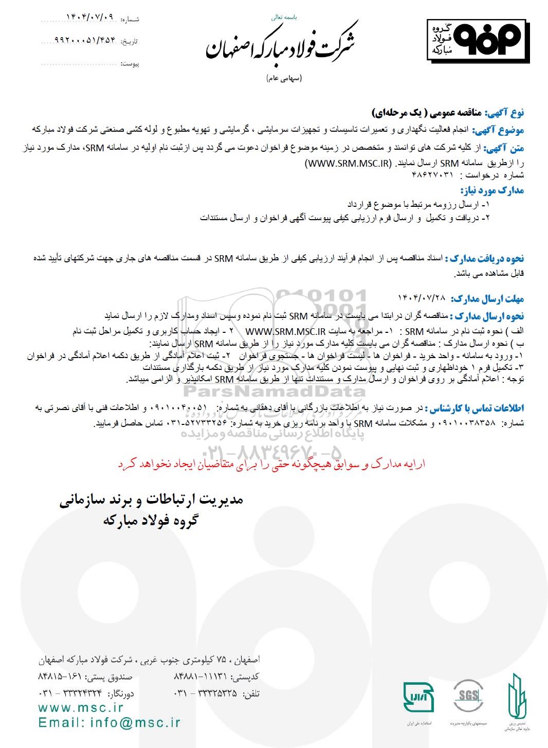 موضوع آگهی: انجام فعالیت نگهداری و تعمیرات تاسیسات و تجهیزات سرمایشی، گرمایشی و تهویه مطبوع و لوله کشی صنعتی شرکت فولاد مبارکه